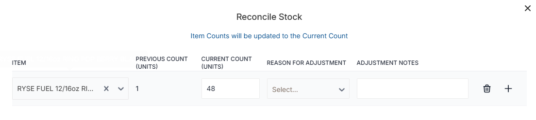 This will override the current stock total. If 48 is entered into the Current Count field, the new total will be 48. The old value is discarded